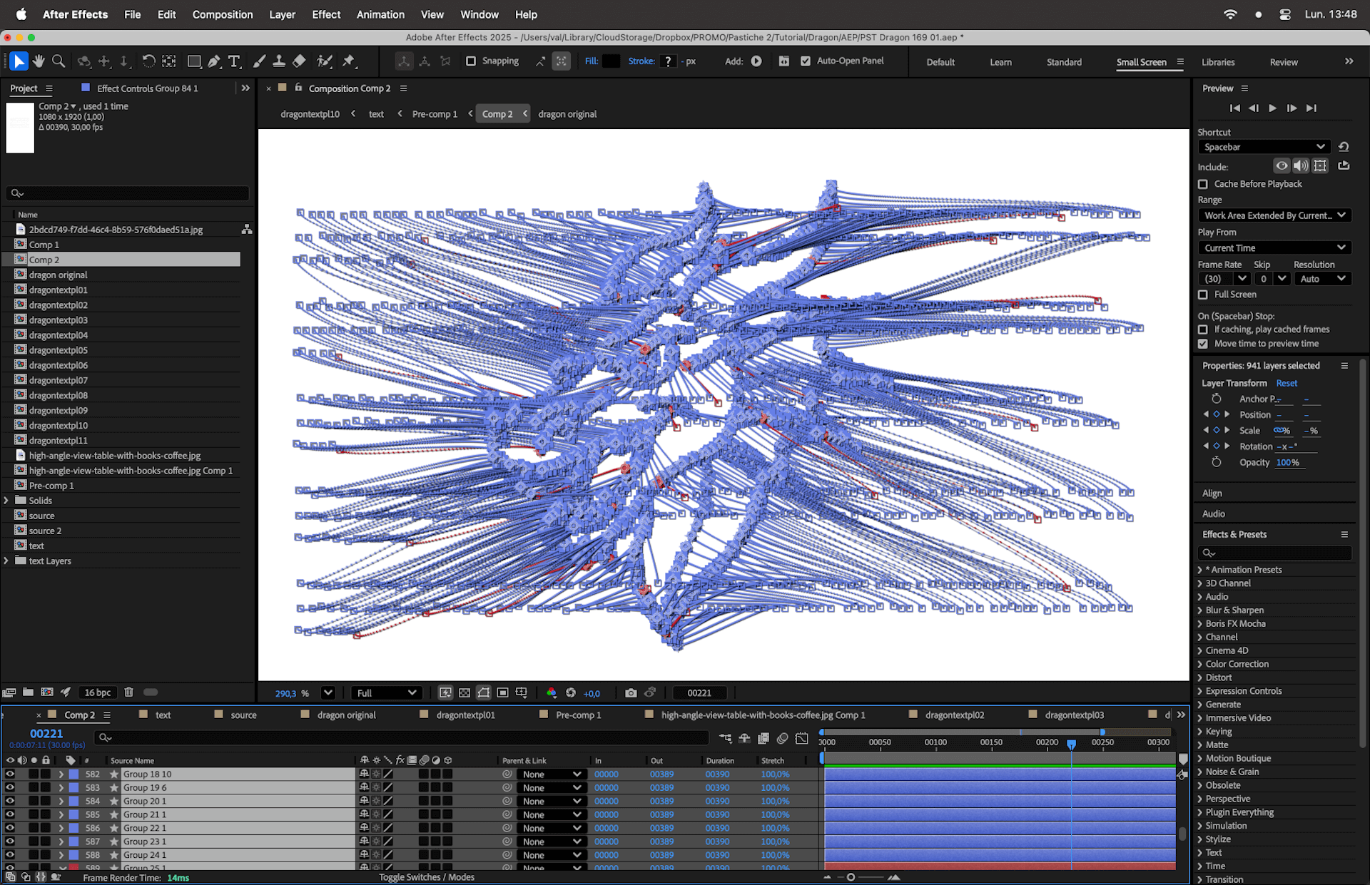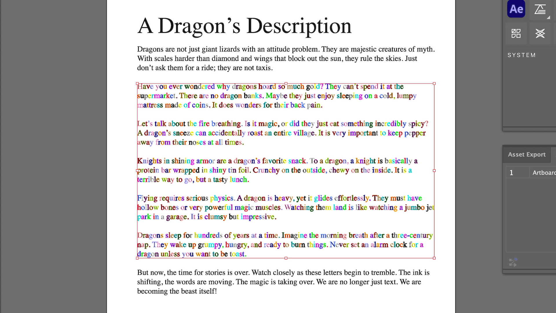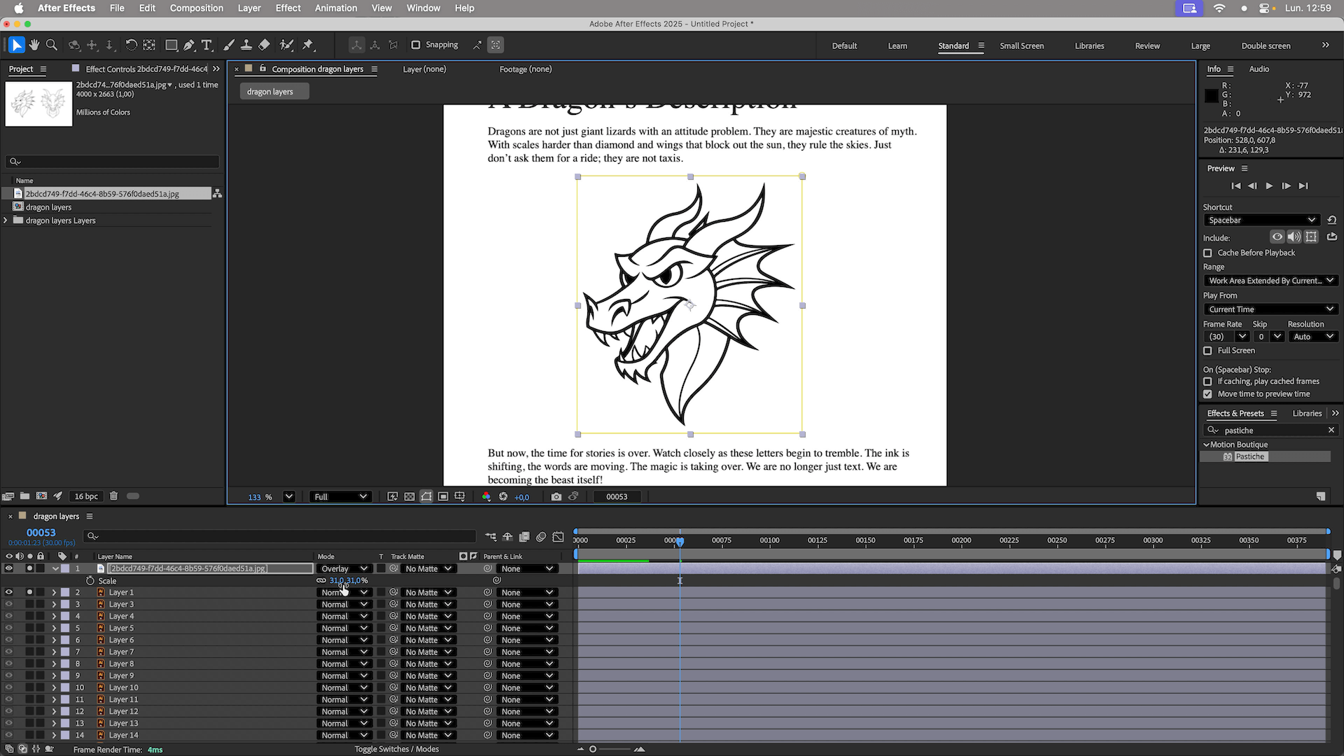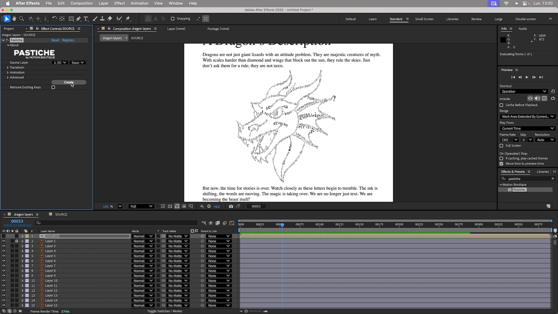 In this After Effects tutorial, I’ll show you how to transform a block of text into a complex illustration (a Dragon head) using Pastiche. We will cover how to manage over 1,000 layers efficiently, use layer markers for animation, and composite the result onto a realistic book page.