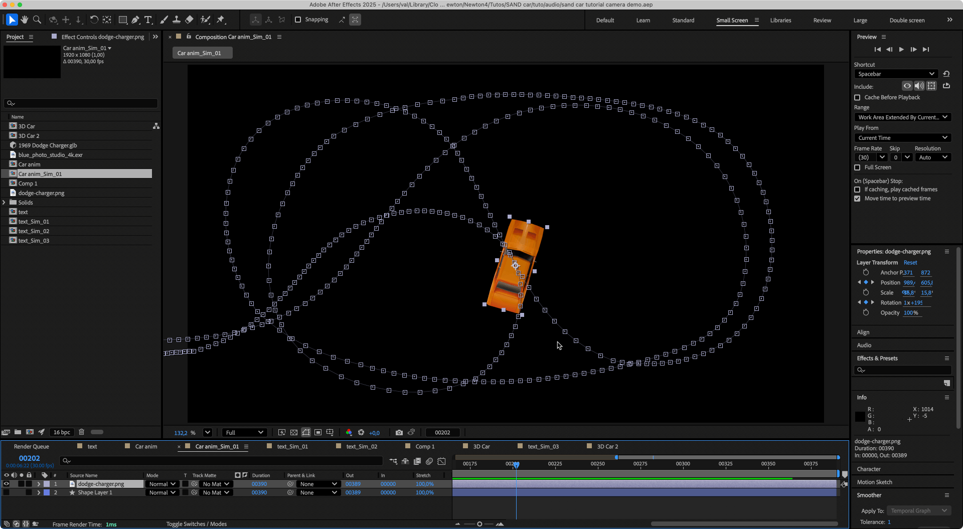 The goal of this tutorial is to simulate a realistic drifting motion using 2D physics, and then map that movement onto a 3D model for a high-quality render. We will use Newton for the rigid body simulation and the Advanced 3D renderer in AE for the car.